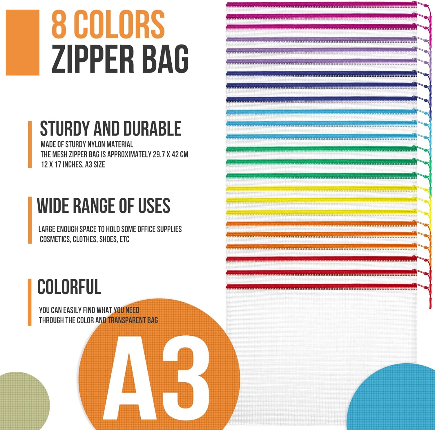 24pcs Mesh Zipper Pouch File Bags Puzzle Storage Bags, A3 17×12 Inches Large Reusable Zipper Pouches for Organizing Classroom Board Game Organization