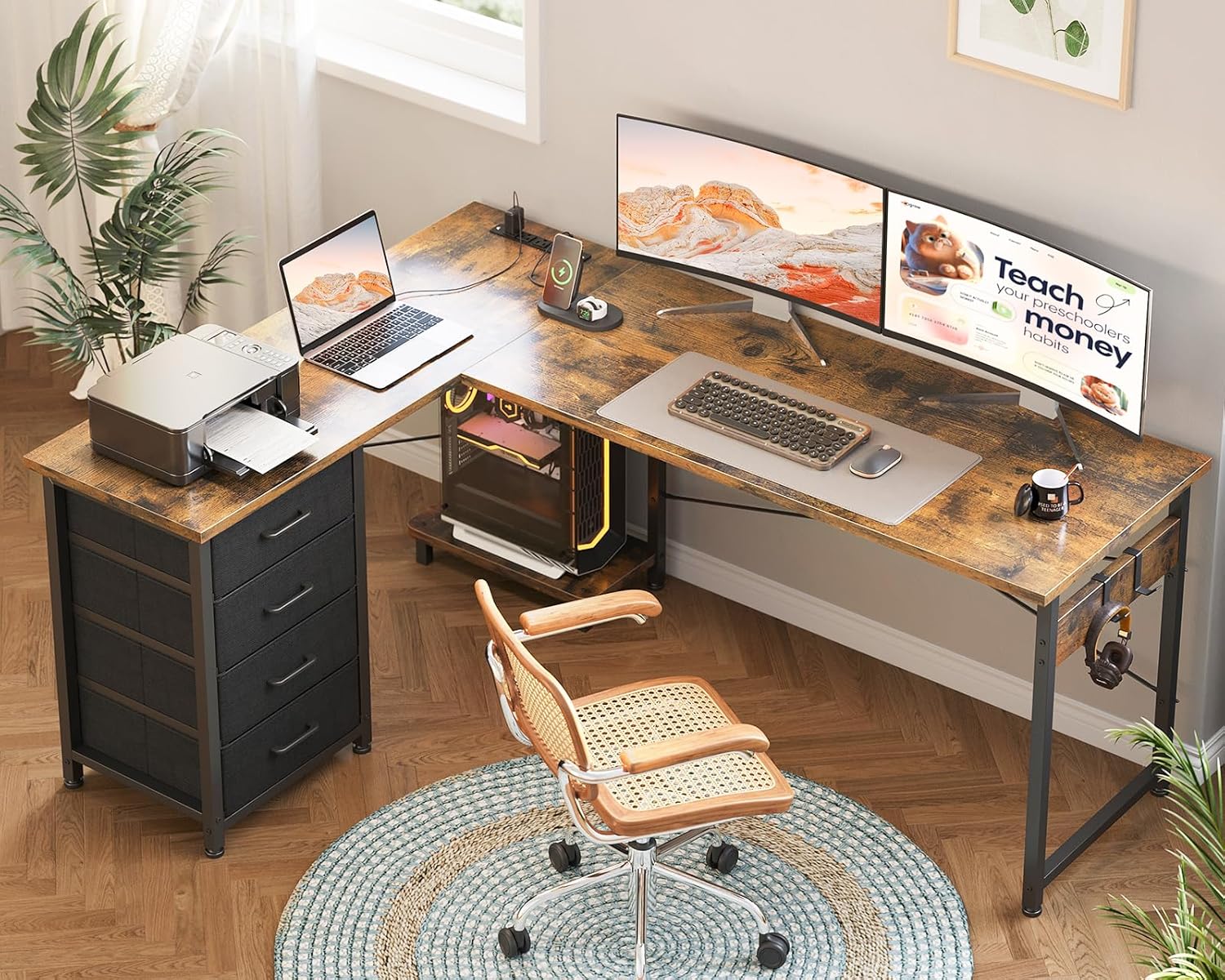 AODK L Shaped Desk with 4 Tier Drawers, 61″ Reversible Gaming Desk with Power Outlets, L Shaped Computer Table with USB Charging Port and Host Stand, Home Office Table, Easy to Assemble, Vintage