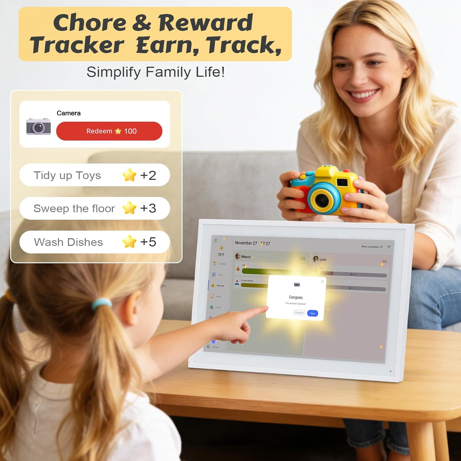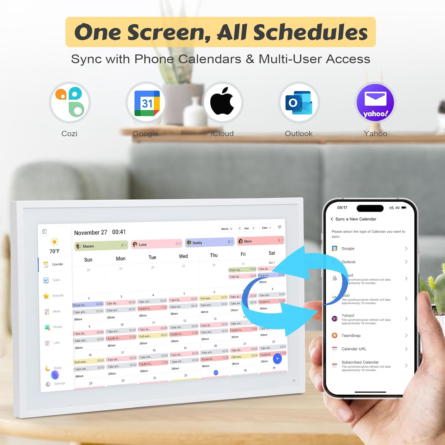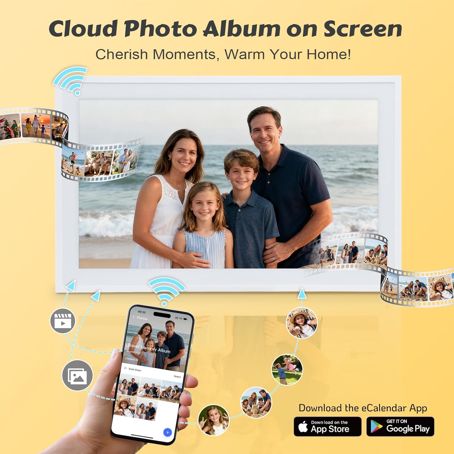 Yes, it syncs photos from iOS/Android devices. Family members download the free ad-free e-calendar app, apply to join the album, and upload photos after the owner’s approval. All members can view shared photos in real time.