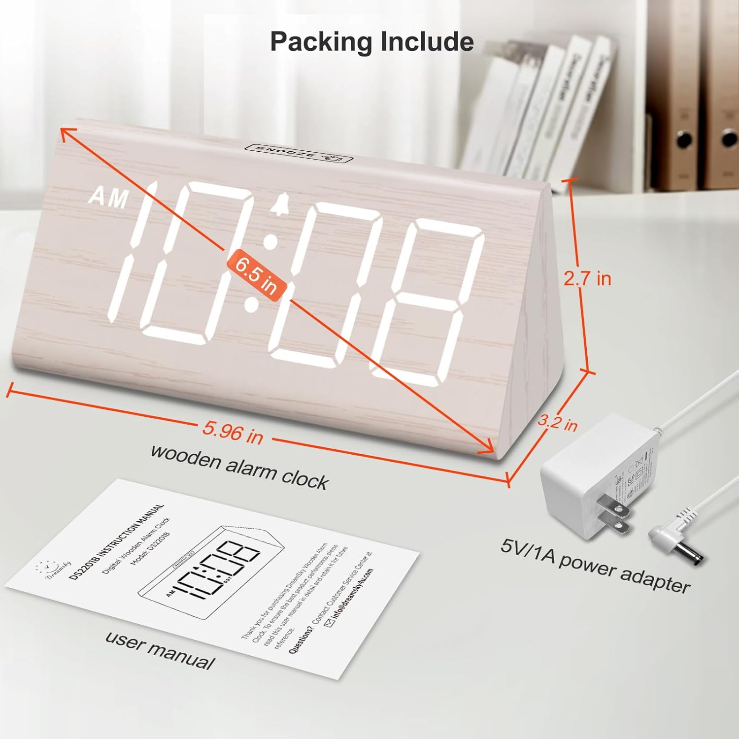 DreamSky Wooden Digital Alarm Clock for Bedroom – Living Room Desk Clock with Large Numbers, Bedside Nightstand Clock with USB Port, Adjustable Volume, Dimmer, DST, Office Wood Décor, Adapter Powered