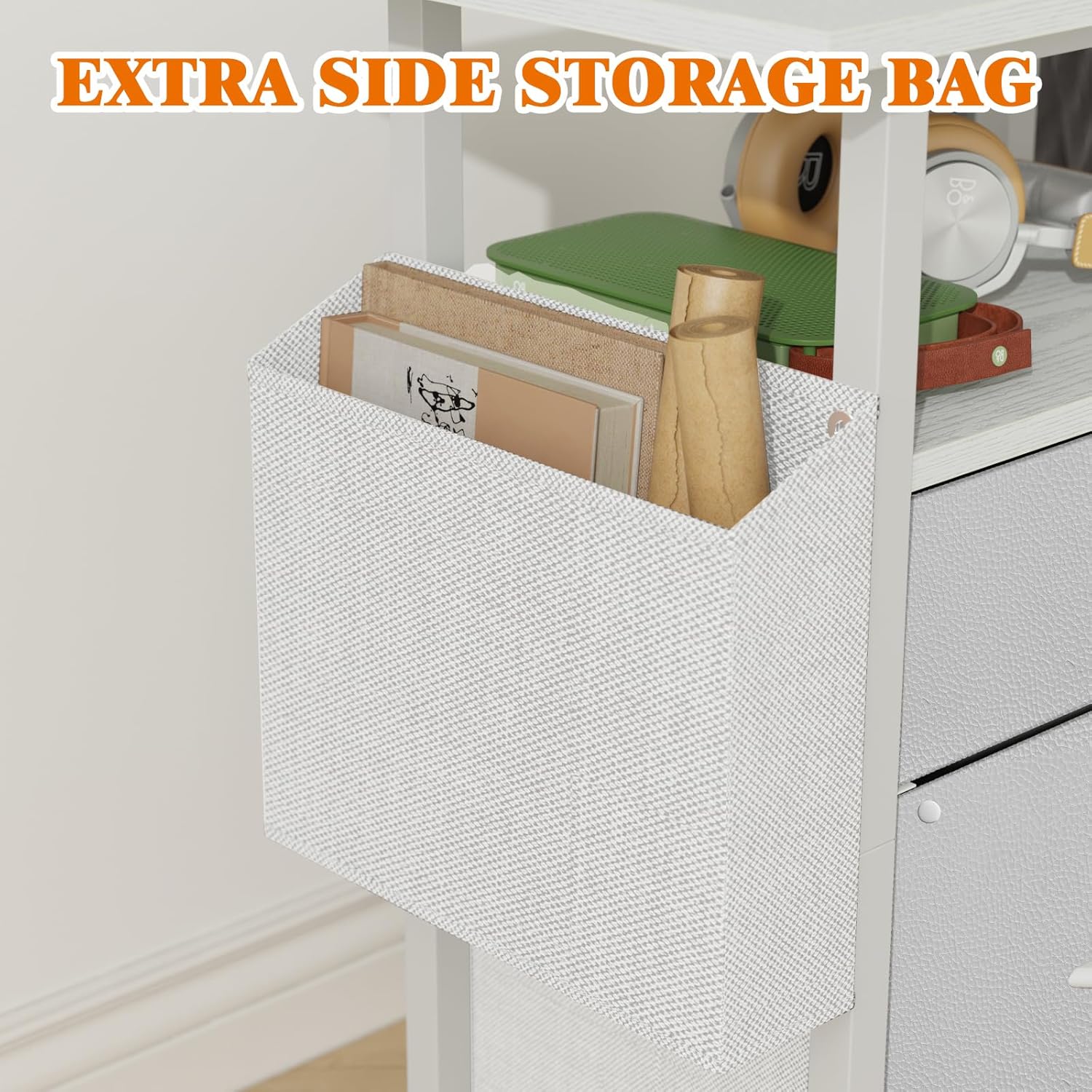 GYIIYUO 2 Drawer File Cabinet with 24” Extended Desktop, Mobile Filing Cabinet, Rolling File Cabinet with Side Bag, Fabric Drawer, Fits A4/Letter Size, Printer Stand Home Office, White