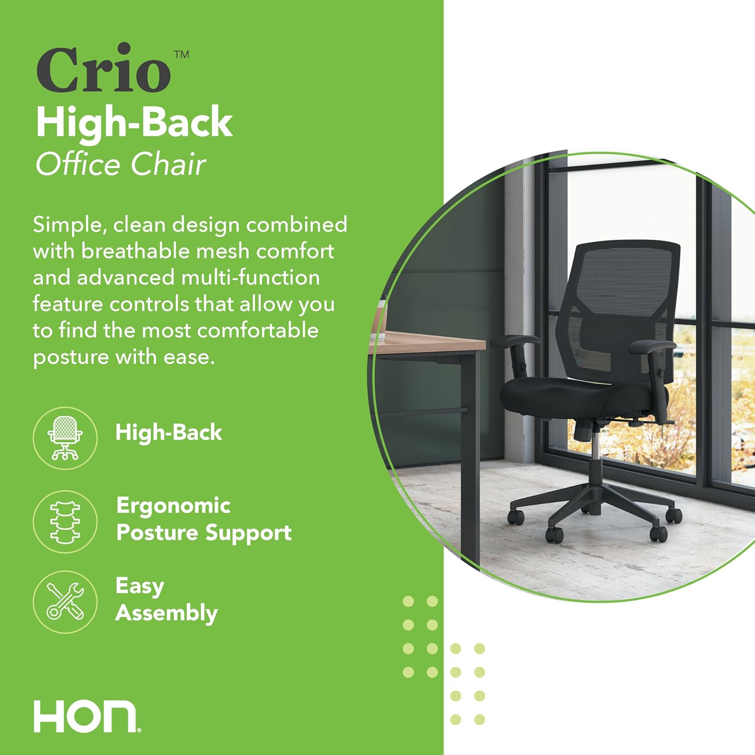 HON Crio Ergonomic Office Chair, High Back Task Chair with Adjustable Arms, Lumbar Support, 360 Swivel, Center-Tilt Recline, for Desks, Computers, Home Office, Black