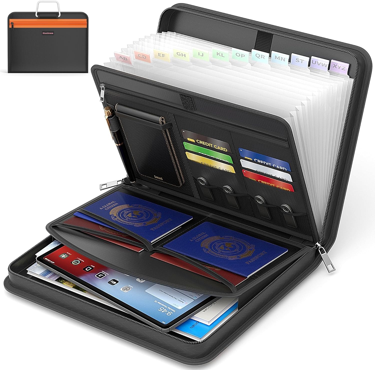 Huolewa Fireproof Accordion File Organizer, Portable Expanding File Folder with Waterproof Zipper&Labels, Black Document Organizer with 13 Pockets, File Organizer for Important Document/Paper Storage