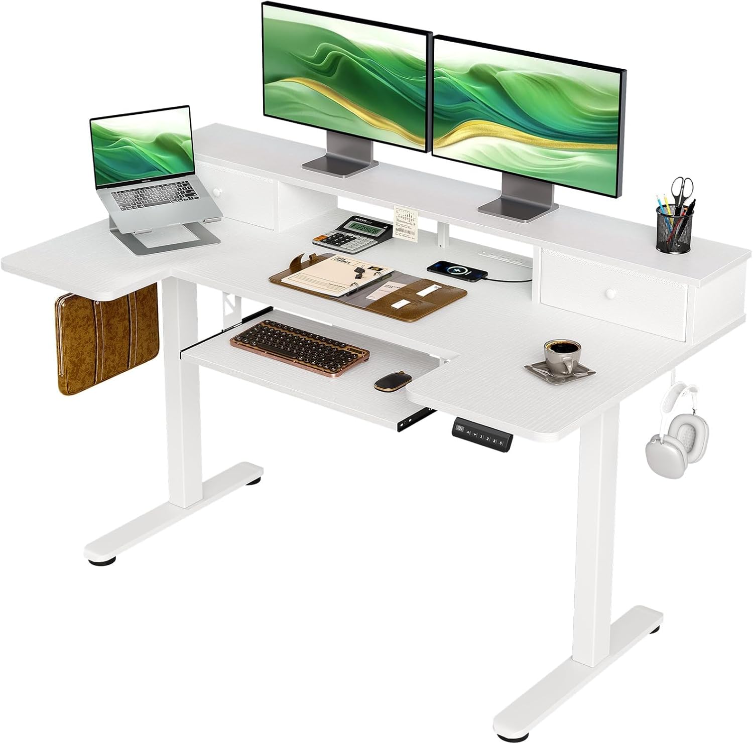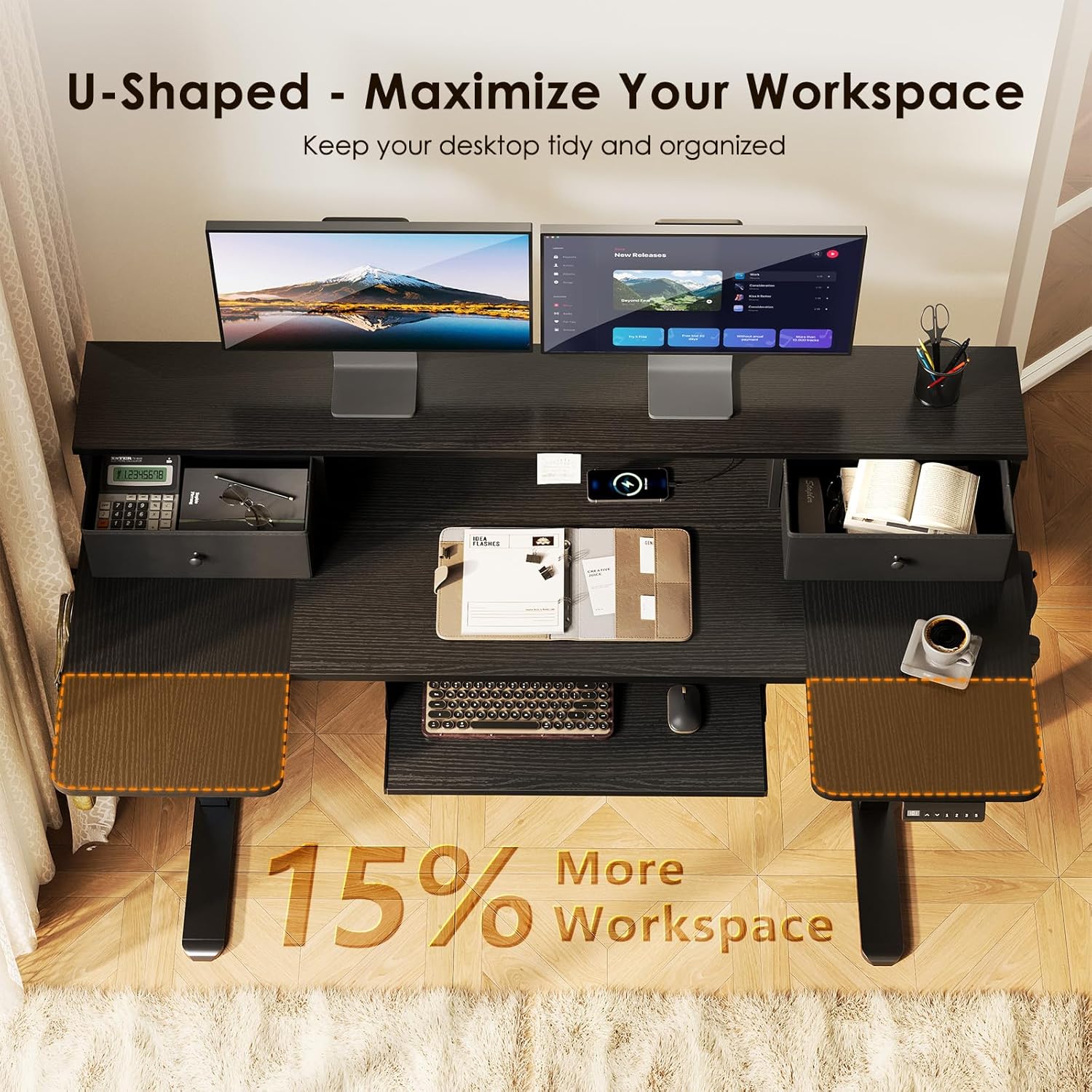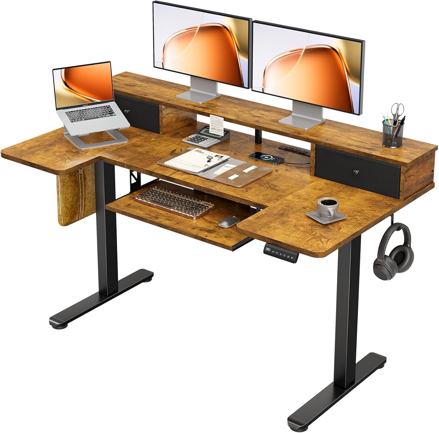 OffiGo U Shaped Electric Standing Desk with Drawers, 55 Inch Height Adjustable Desk with Keyboard Tray & Ergonomic Monitor Stand, Sit Stand Table with Power Outlets for Home, Office, Black