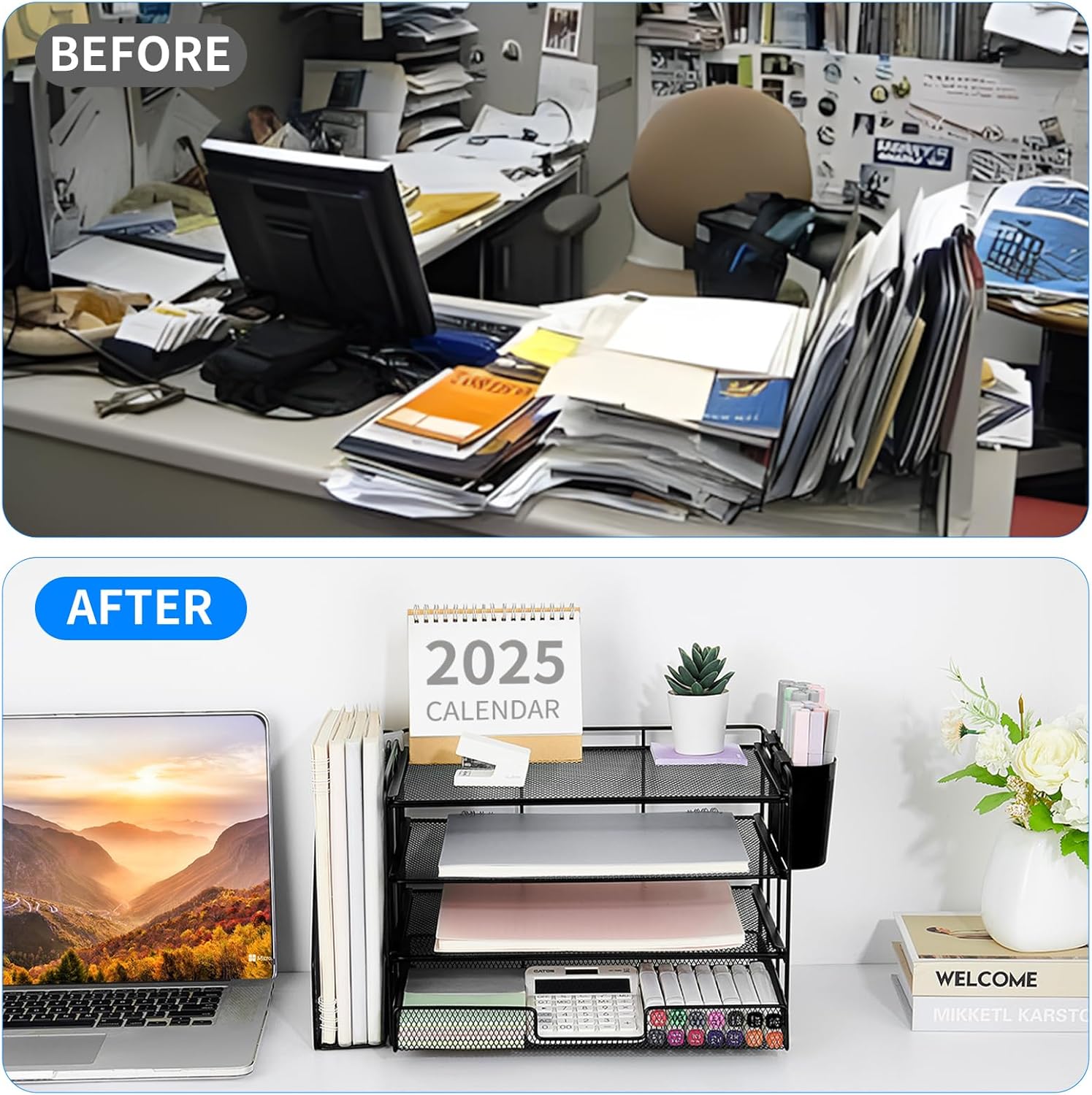 This desk organizer comes with a four-tier grid paper tray that categorizes files, papers and small items for easy access, helping you keep your desk tidy with ease.
