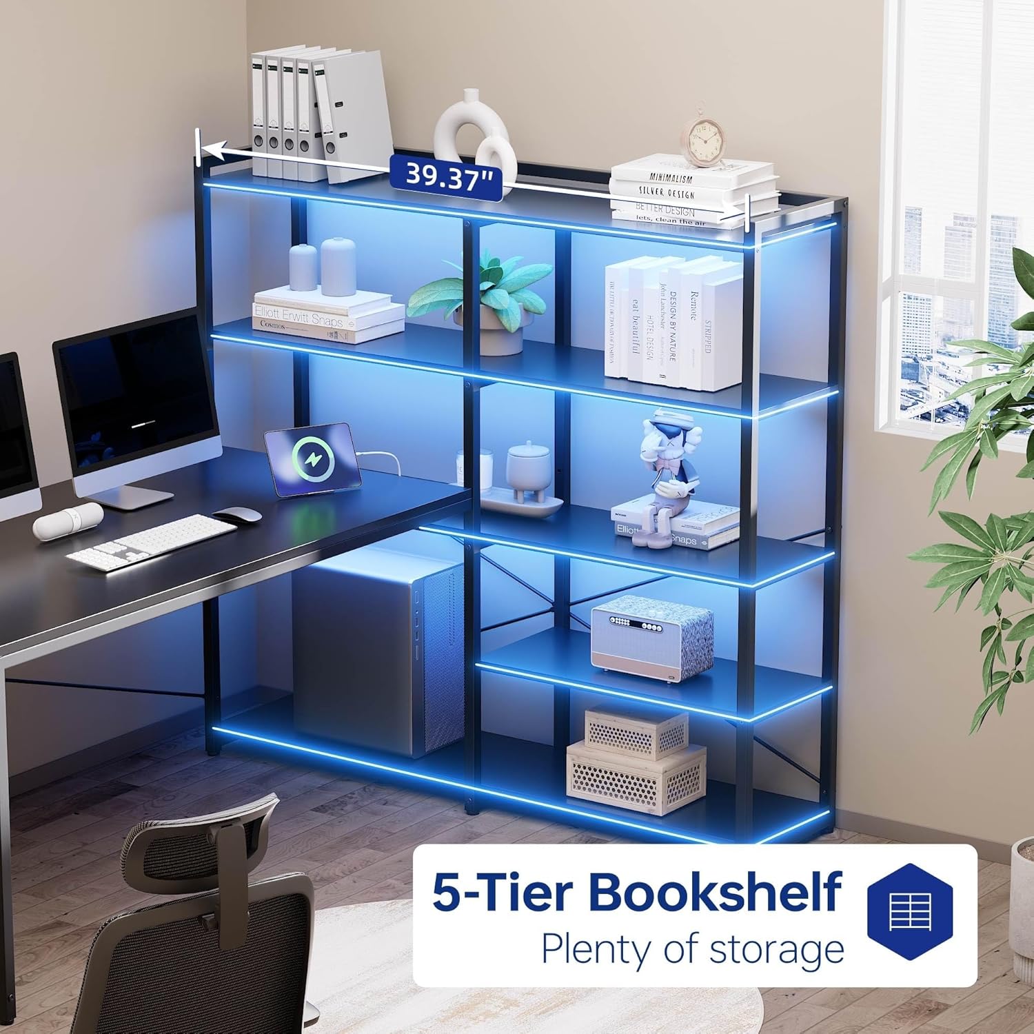 Pamray L Shaped Computer Desk with Reversible Side Storage Shelves, 49 Inch Gaming Desk with Power Outlets and Led Lights, PC Table for Home Office and Bedroom Black