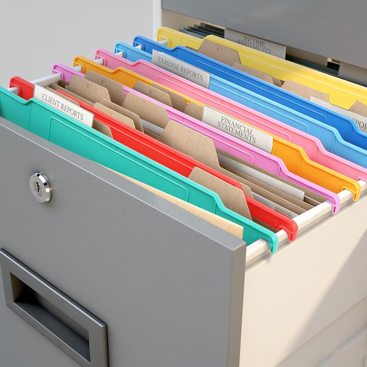 Featuring a vibrant rainbow of 8 distinct colors, these filing cabinet dividers allow for instant visual identification.The ingenious hanging design allows these hanging cabinet dividers to fit appropriately into most standard filing cabinets and shelving systems.They are the ideal solution for transforming cluttered documents into a well-ordered, easy-to-navigate filing system.