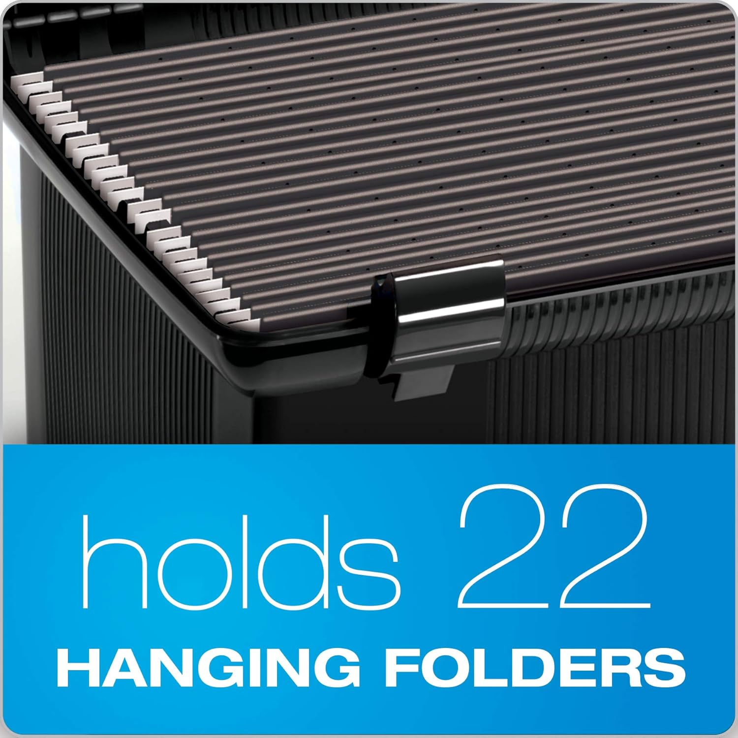 - Create the perfect portable file system for on the go organization; plastic file box has a hinged lid with double latches; file rails hold up to 22 folders; includes 3 hanging files, tabs and inserts